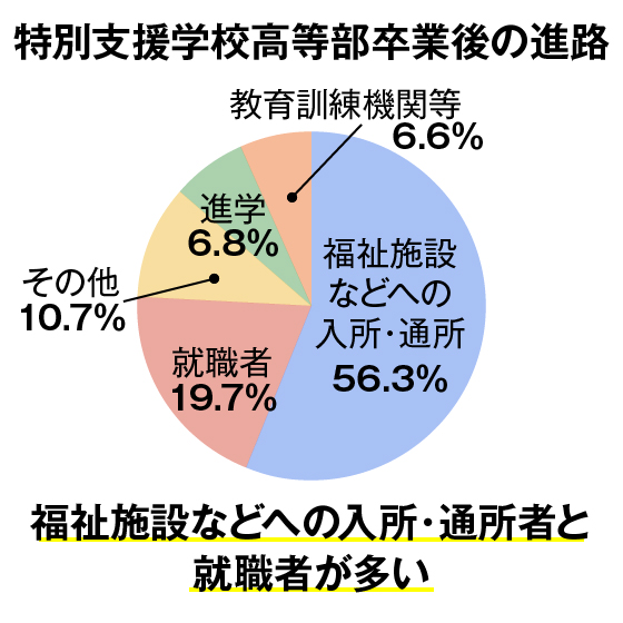 文部科学省が発表した特別支援学校高等部の卒業後の状況(国・公・私立計)によると、社会福祉施設などへの入所・通所が56.3%、就職者が19.7%、その他(家事手伝いをしている者、外国の学校に入学した者など)が10.7%、進学者が6.8%、教育訓練機関等が6.6%でした。